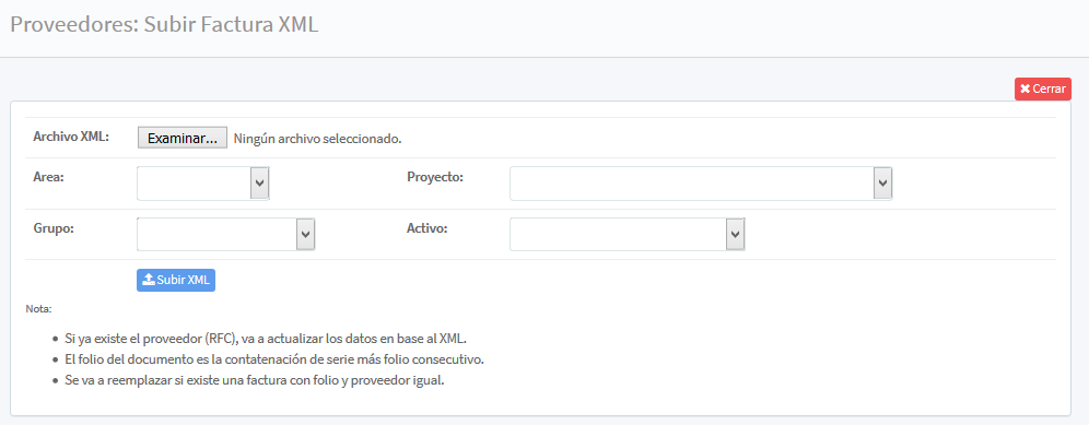 Aparece en la parte inferior un botón “subir XML” que permitirá cargar el archivo XML de la factura en el sistema, una vez realizado se podrá cerrar la ventana con el botón “cerrar” en la parte superior derecha, regresando a la pantalla principal Proveedores: Facturas.