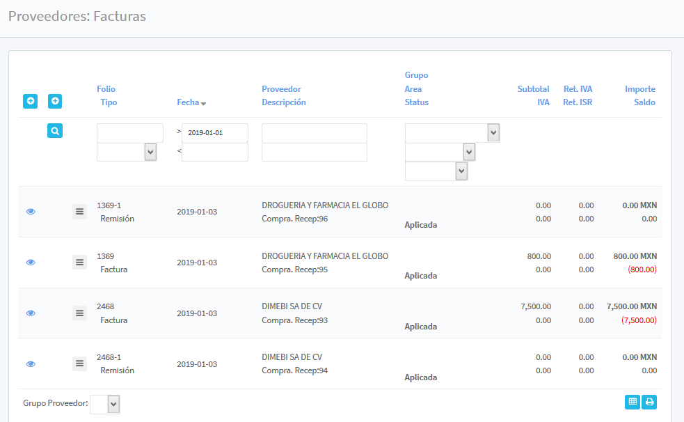 Además de las opciones de “Nuevo” antes explicadas, se podrá realizar además la búsqueda de facturas ya realzadas, desglosando los siguientes datos: Folio (Mostrando número de folio asignado al momento de realizar la factura a proveedor), Tipo (en la parte de debajo de folio con un cuadro de lista para seleccionar; Factura, Remisión o Nota Crédito), Fecha (con dos cuadros para muestra del periodo en que se realizó la factura), Proveedor /Descripción (con la información del proveedor al que se realizó la factura), Grupo / Área /Status/ (cuadro de dialogo que despliegue las opciones de selección; Pendiente, Aplicada, Cancelada, Pagada), Subtotal IVA, Ret. IVA/Ret. ISR, Importe saldo.