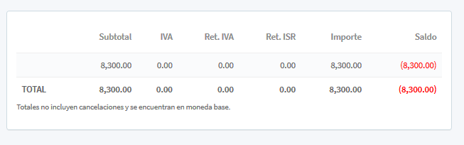 En la parte inferior izquierda aparece un recuadro de resumen que muestra el total de la factura seleccionada, con los datos antes mencionados.