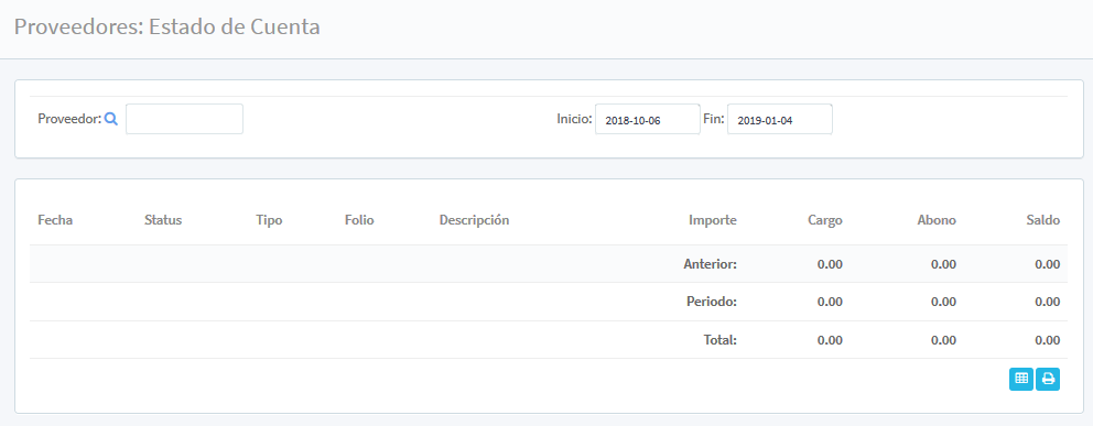 El primer filtro de búsqueda es Proveedor (con el icono de búsqueda, se selecciona de la base de datos el proveedor que se desee consultar), Fechas Inicio y Fin (con dos cuadros de dialogo donde se selecciona en el calendario el periodo que se desee consultar).