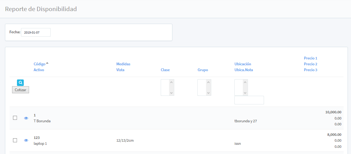 La información que se desplegara al indicar la fecha de consulta es: Código del Activo, Medidas, Clase, Grupo, Ubicación y Precios (los que estén categorizados en el sistema)