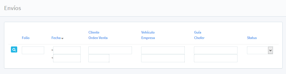 Una vez realizada la orden de venta, en el apartado de Envíos como su nombre lo indica se puede realizar la búsqueda sobre el envío que se haya realizado al cliente de su compra, en el menú de despliegue; Folio (con el folio que arrojo la orden en su elaboración), Fecha (con dos campos que permite indicar la Fecha de inicio y/o fecha final, indicando un rango), con el Cliente / Orden de Venta (introducir nombre de paciente por, nombre, apellido paterno y/o apellido materno), Vehículo /Empresa (como dato de cliente), Guía Chofer (como modo de identificación del envío) y por último Status (de la orden de venta) con las siguientes opciones; Pendiente, Aprobado, Cerrado y Cancelado)