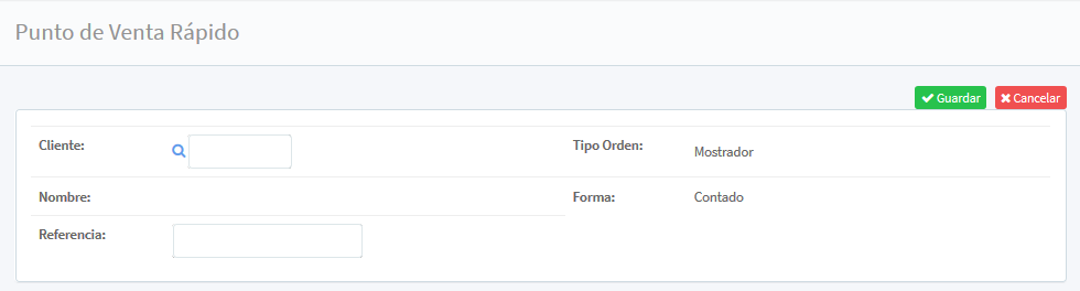 El primer dato a ingresar; Cliente (se selecciona de la base de datos de cliente con el icono de búsqueda), Arroja el Nombre, Referencia (se ingresa una referencia de la venta), Tipo Orden y Forma (de la venta).