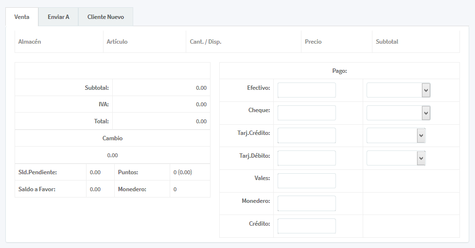 1. Venta: Donde se registran los detalles de la venta, seleccionando el Almacén (de la lista general del almacén), Articulo, Cant. /Disp. Precio y Subtotal. En esta modulo se muestran los detalles de la venta, como tipo de pago y totales de puntos en monedero, así como saldo a favor.