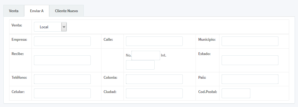 2. Enviar A: Muestra los datos generales de la venta a quien se realiza el punto de venta; Venta (si es local, nacional o extranjera), Empresa, Recibe, Domicilio, Estado, Teléfono, Colonia, País, Email, Ciudad, Cód. Postal.