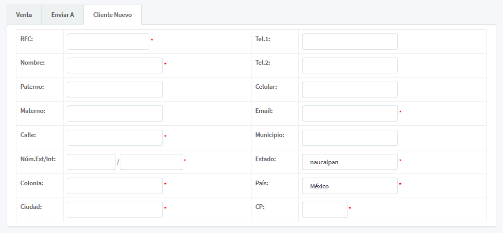 3. Cliente nuevo: Se ingresan los datos si se realiza el registro de cliente nuevo: RFC, Nombre, Paterno, Materno, Calle, Un. Ext., Colonia, Ciudad, Tel.1, Tel. 2, Celular, Email, Municipio, Estado, País, CP.
