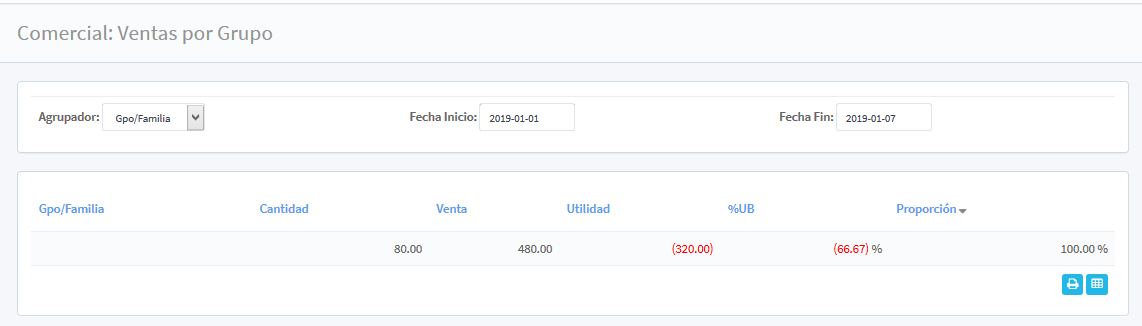 Este apartado permite el reporte de las ventas seleccionadas por grupo del producto, en la parte superior se encuentra el despliegue del calendario para indicar el periodo de búsqueda; Agrupador, Fecha inicio y Fecha fin.